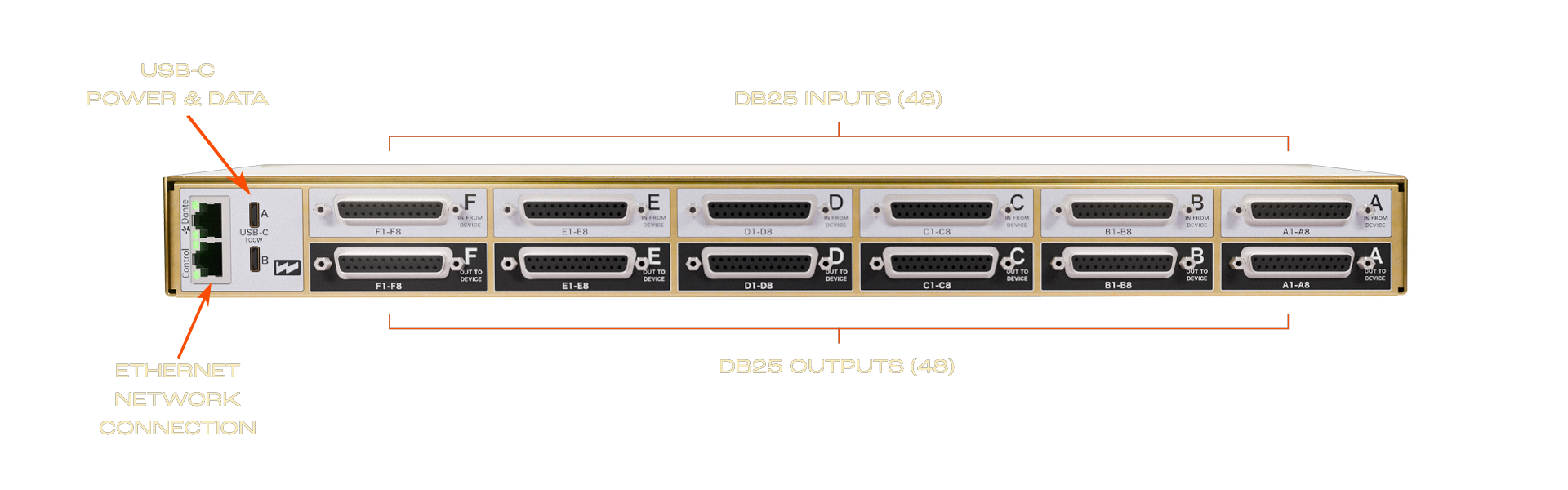 128 patch points are available as 12 rear panel DB25s, 16 TT I/O pairs on the front panel, 4 XLR/TRS combo jacks and 4 TRS jacks.